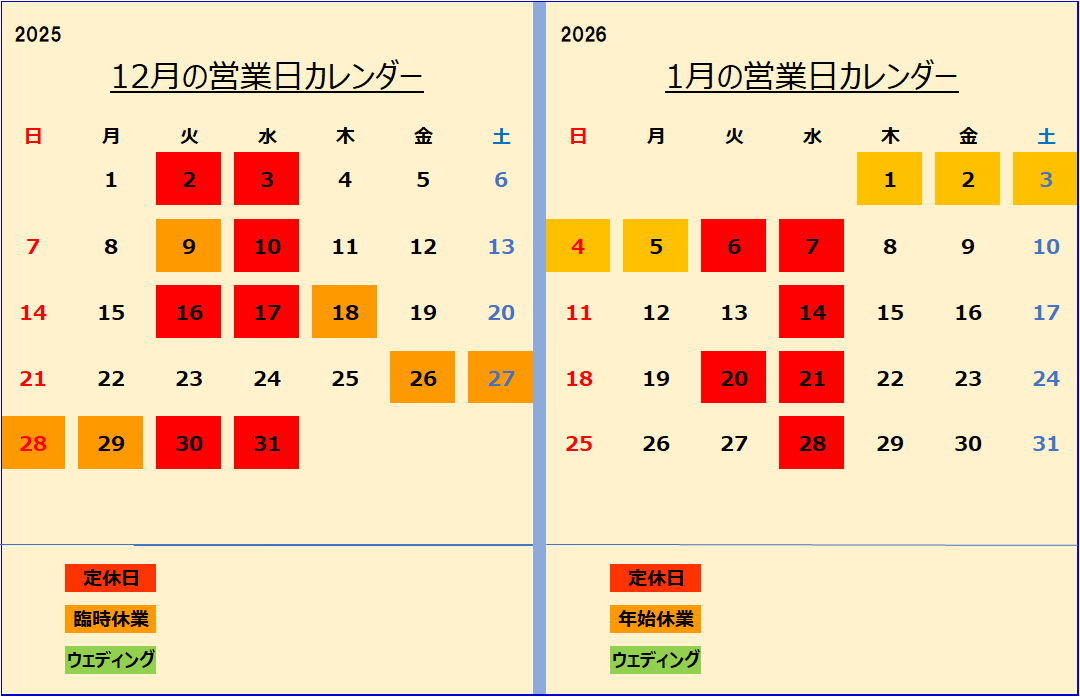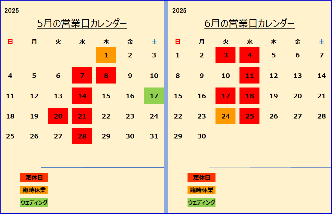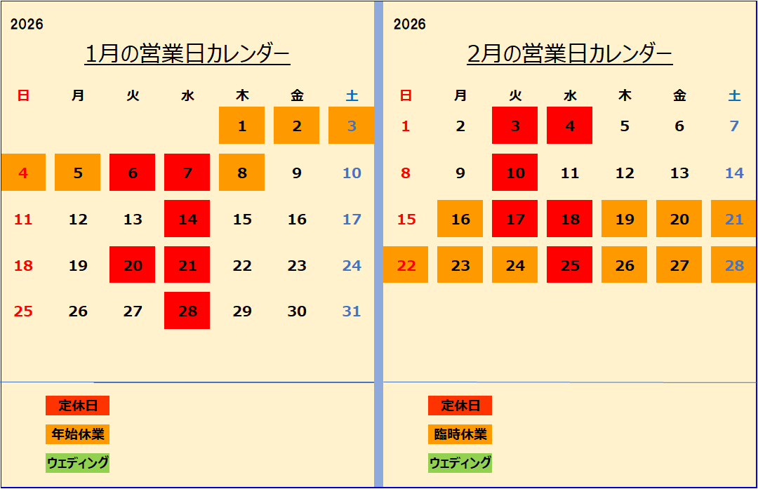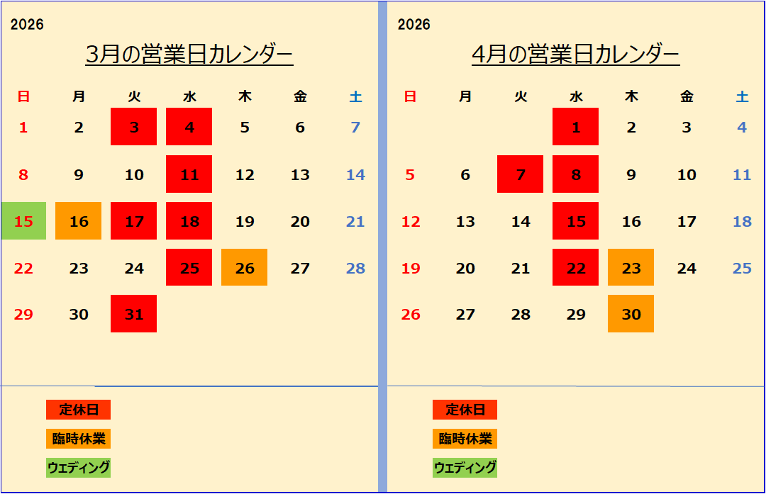 第1.3.5火曜日、毎週水曜日が定休日です。