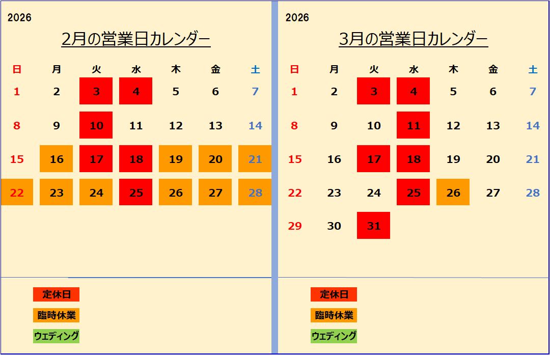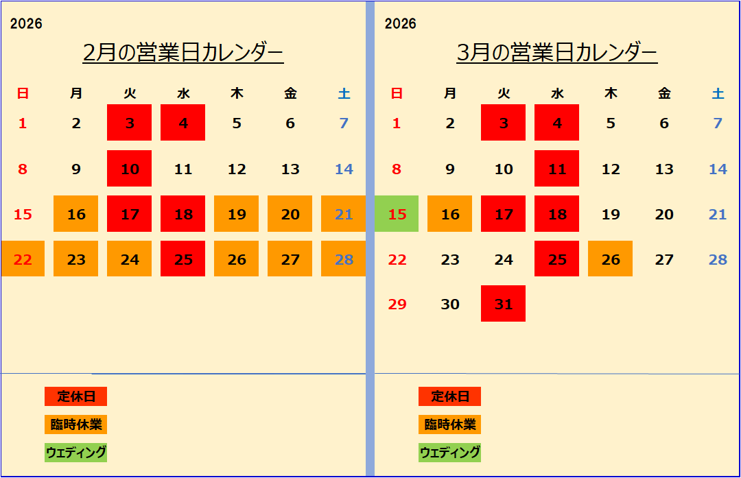 第1.3.5火曜日、毎週水曜日が定休日です。