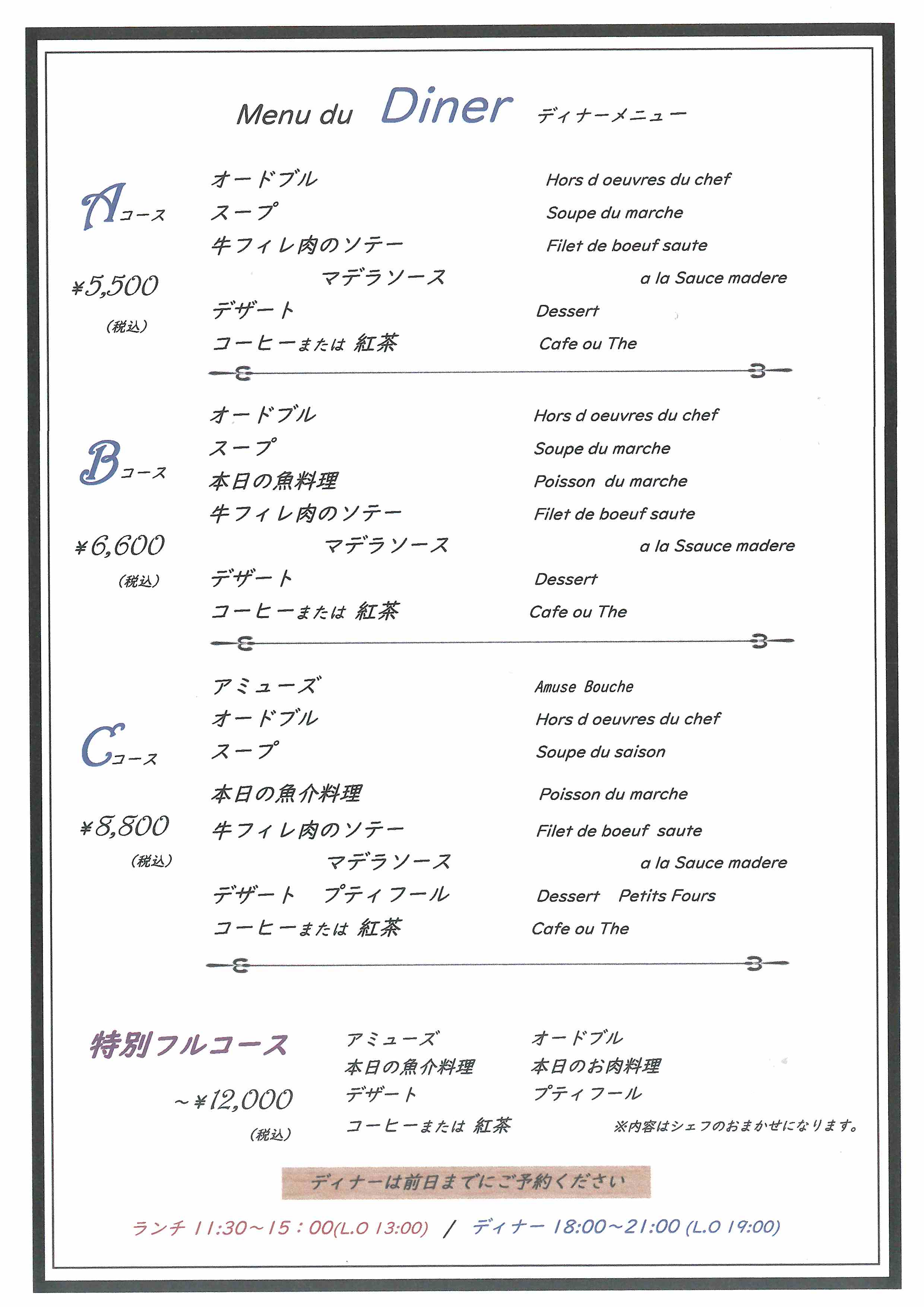 ディナーは予約制となっておりますので、前日までにご予約ください